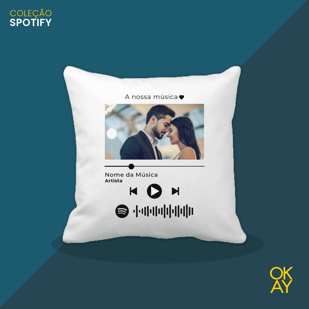 Capa de almofada quadrado com personalização Especial Spotify com Nome da música, artista e o código do Spotify para abertura imediata na app da música em específico, álbum ou página de um artista e ainda uma foto à sua escolha.