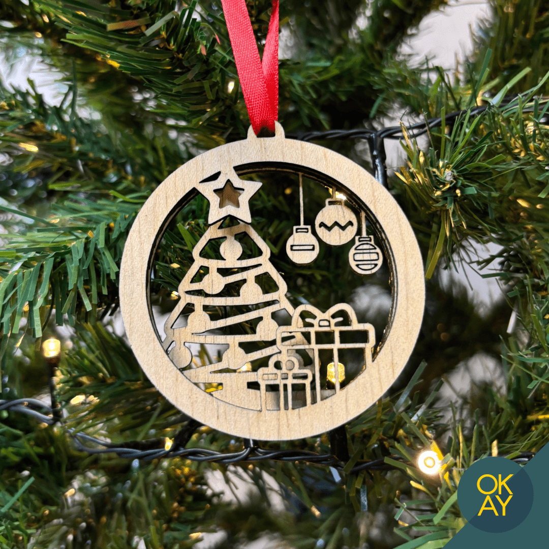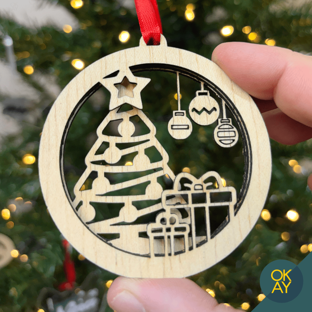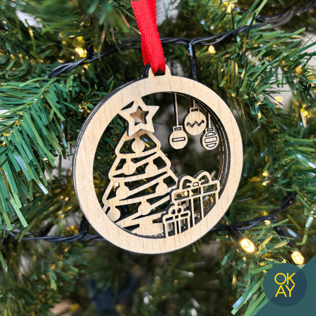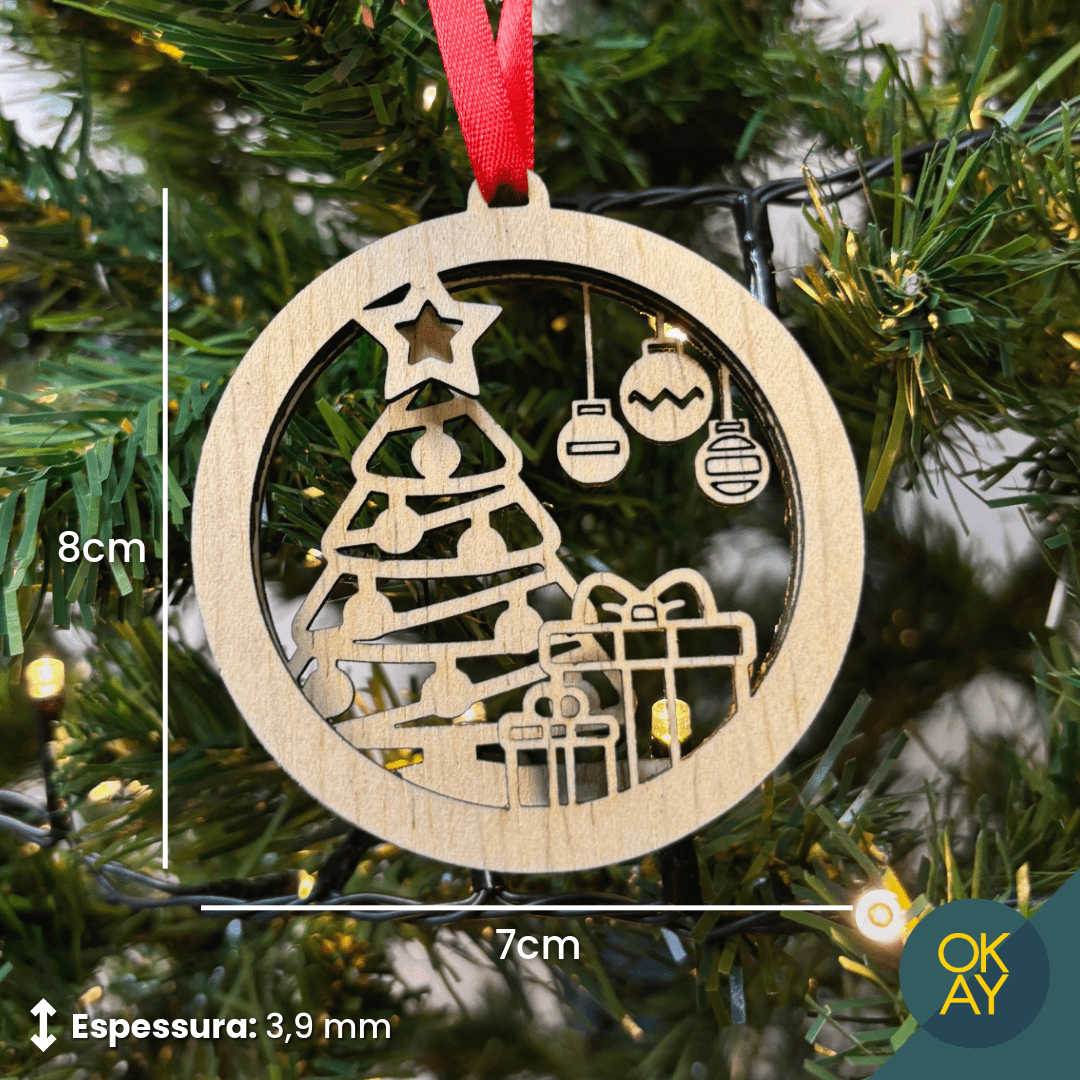 Ornamento de Natal em madeira com 2 camadas em forma de bola cortado a laser, inclui fio para pendurar.