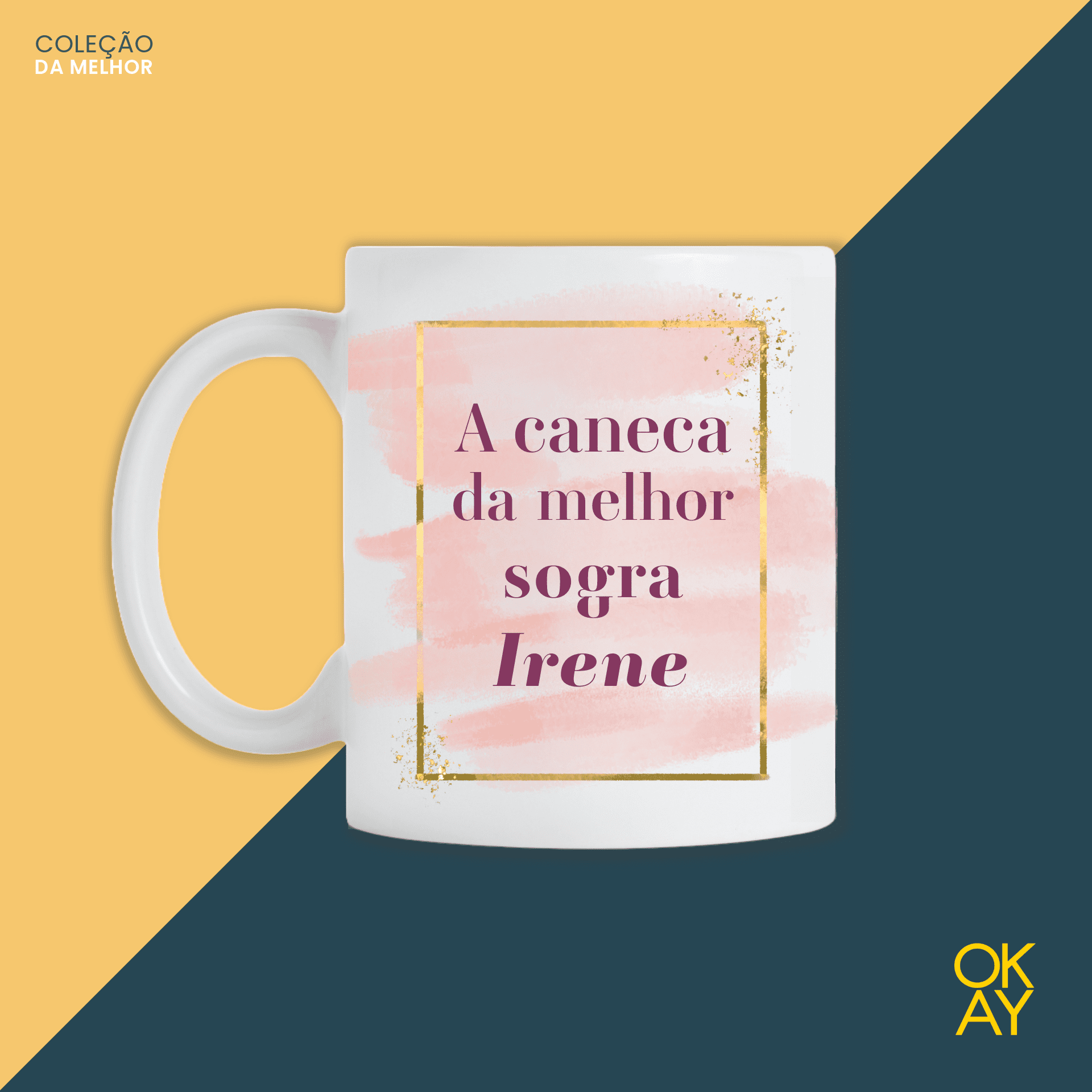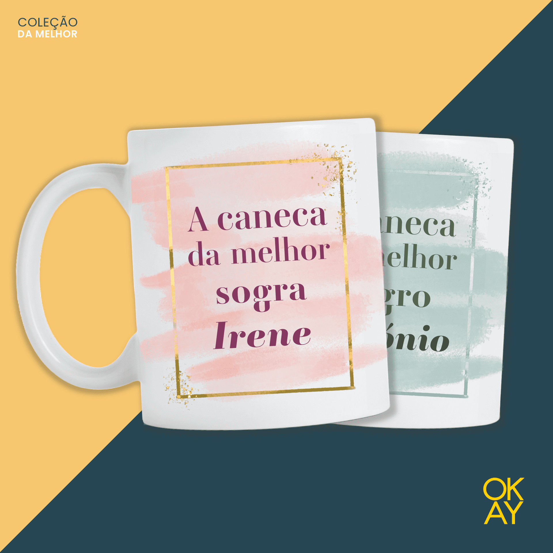 Caneca em porcelana branca de 300ml personalizada com a frase ‘A Caneca da Melhor Sogra’ ou ‘A Caneca do Melhor Sogro’.