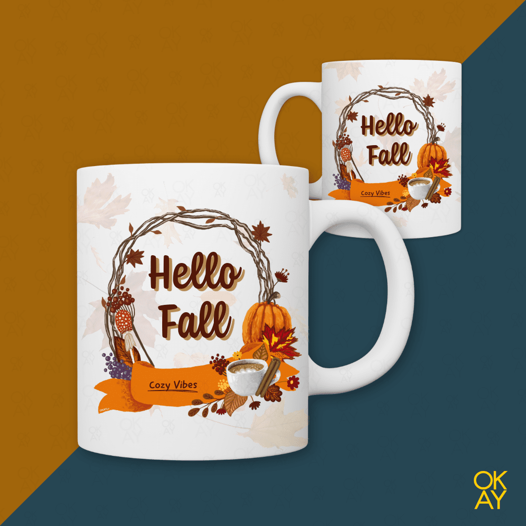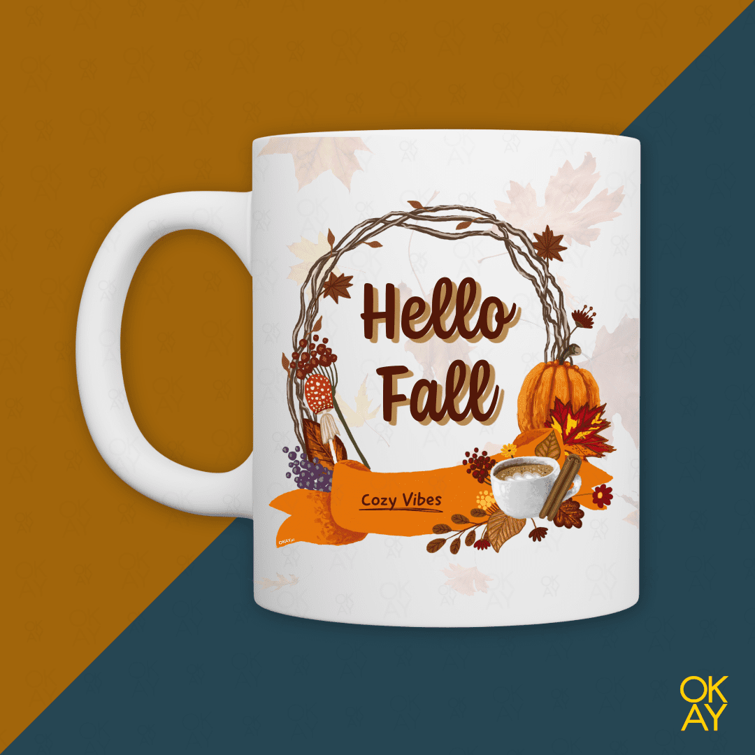 Caneca em porcelana personalizada com o tema de outono e com a frase Hello Fall.