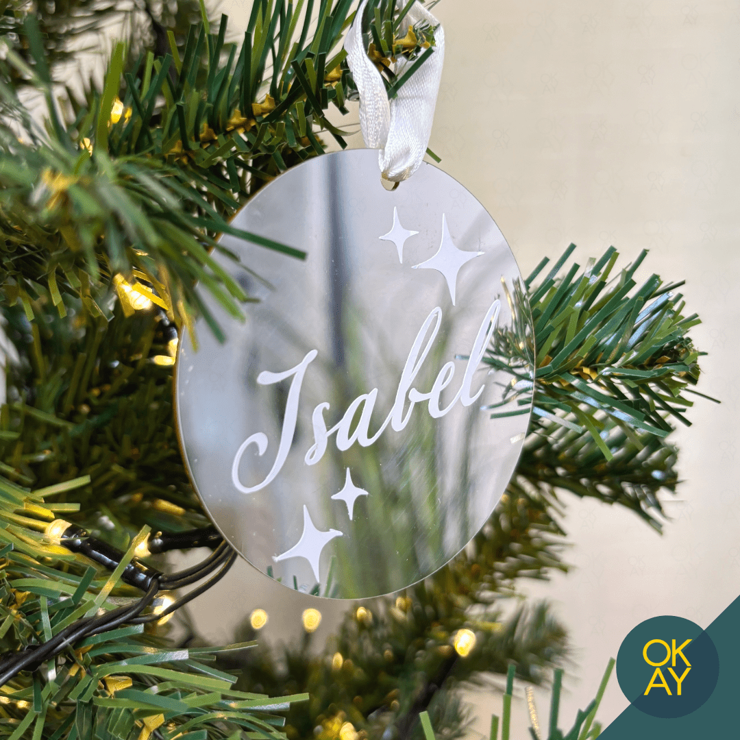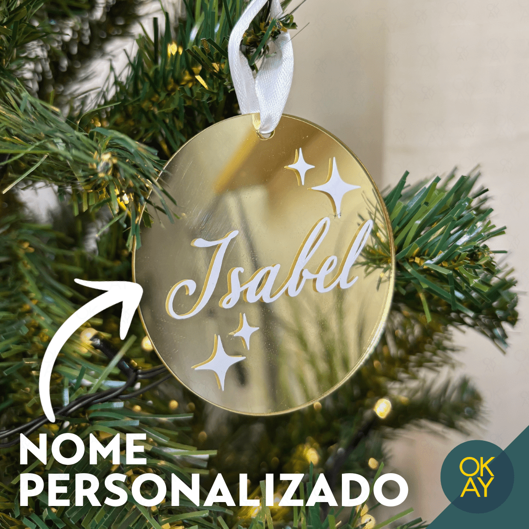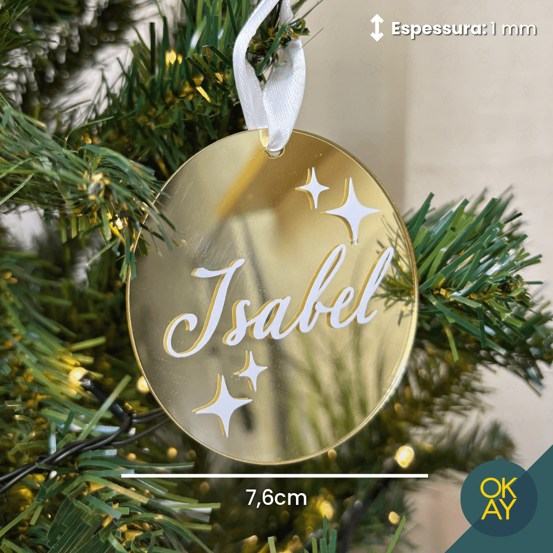 Ornamento em forma circular em plástico dourado de um dos lados e prateado do outro com a possibilidade de personalização com nome e escolher a cor de fundo.