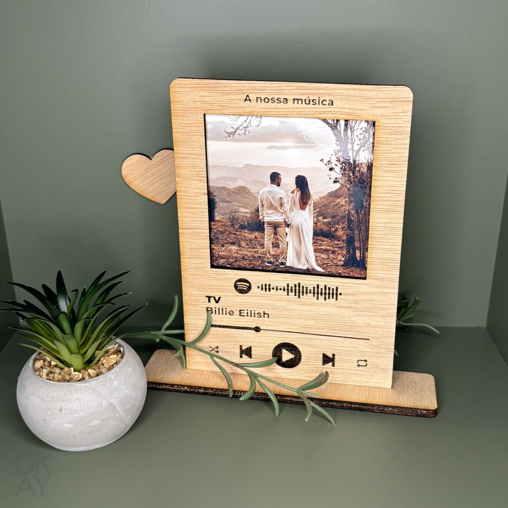 Placa moldura com espaço para uma foto e código do Spotify para uma música, basta apontar a câmara do Spotify (aba pesquisar) e a música começa a tocar.