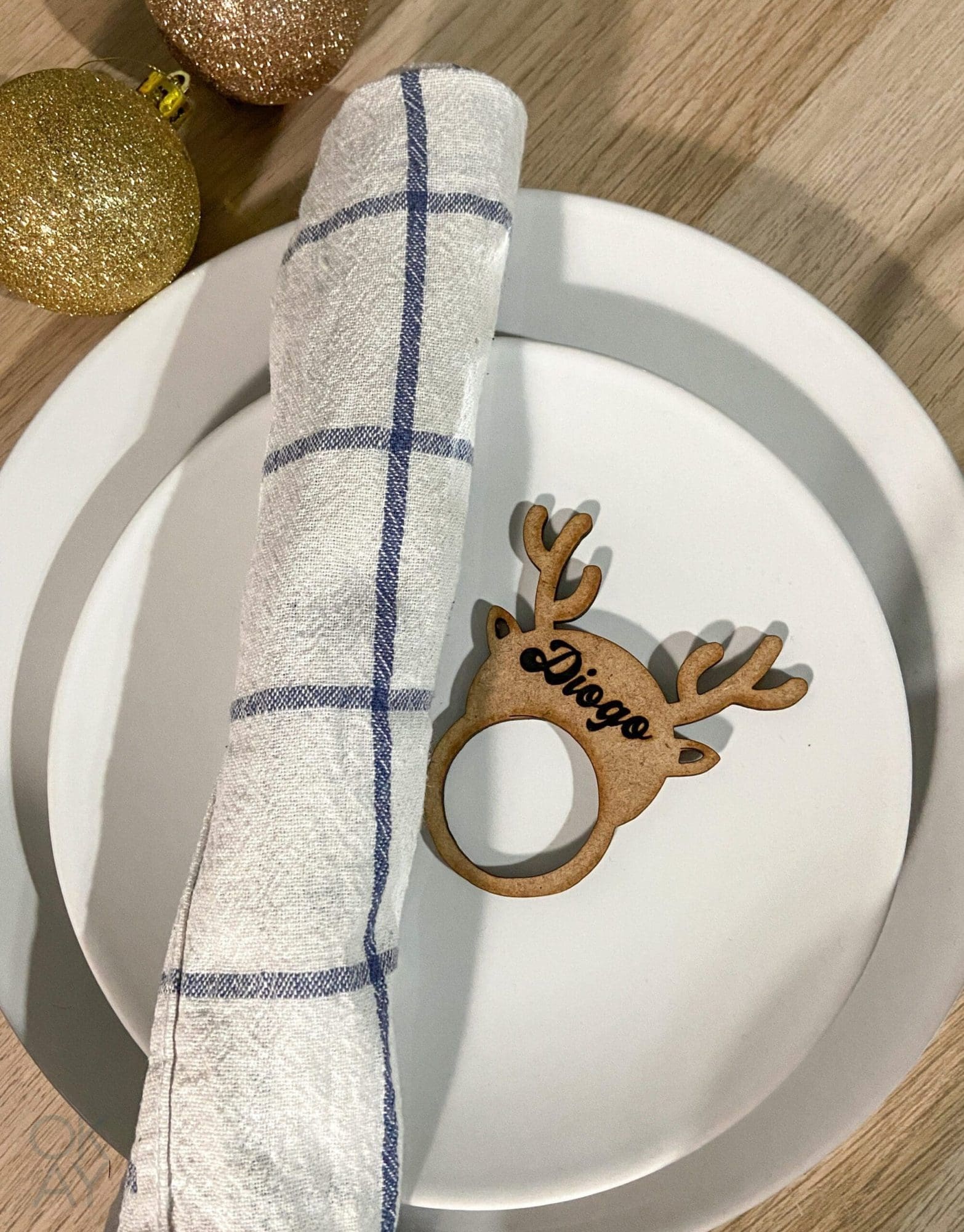 Suporte para guardanapo em forma de rena cortado a laser e com gravação de um nome à escolha, perfeito para identificar lugares na mesa.